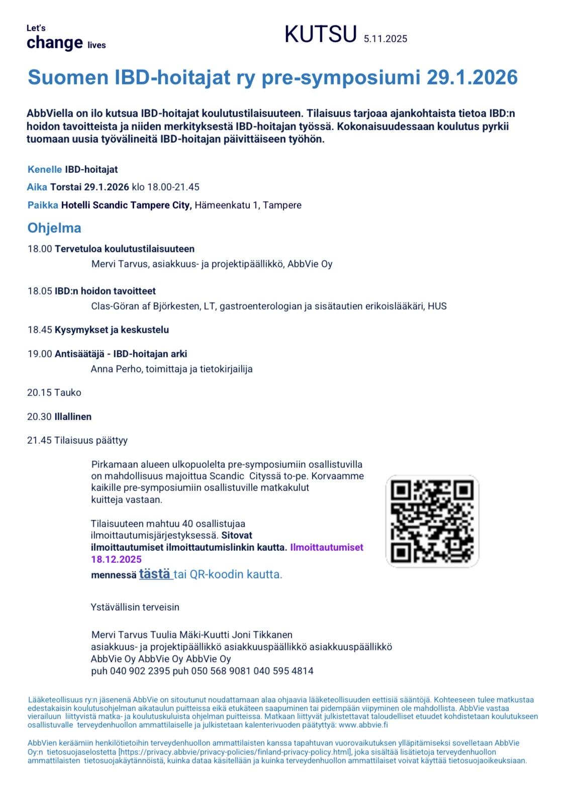 Koulutuspäivää edeltävänä iltana 29.1.2026 yhteistyökumppanimme AbbVie Oy järjestää Pre-symposiumin! Ilmoittautumislinkki: Suomen IBD-hoitajat ry - pre-symposiumi 29.1.2026 tai kutsun QR-koodin kautta.